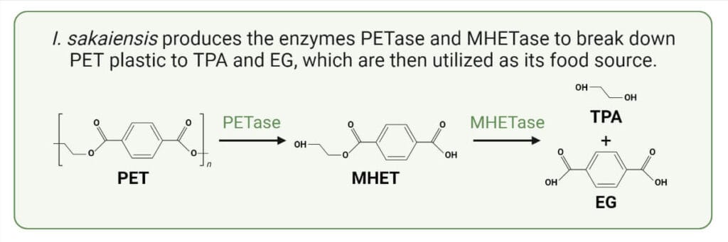 - Ideonella sakaiensis adhere to the PET plastic surface using their flagellum. Once adhered, they secret PET-degrading enzyme, the PET hydrolase (PETase) enzyme on the surface of the plastic. The PETase enzyme breaks down the PET polymer into mono (2-hydroxyethyl) terephthalic acid (MHET) and a trace amount of terephthalic acid (TPA), bis (2-hydroxyethyl) terephthalic acid (BHET), and ethylene glycol (EG) as secondary products. The BHET is an intermediate product that will be converted into MHET.